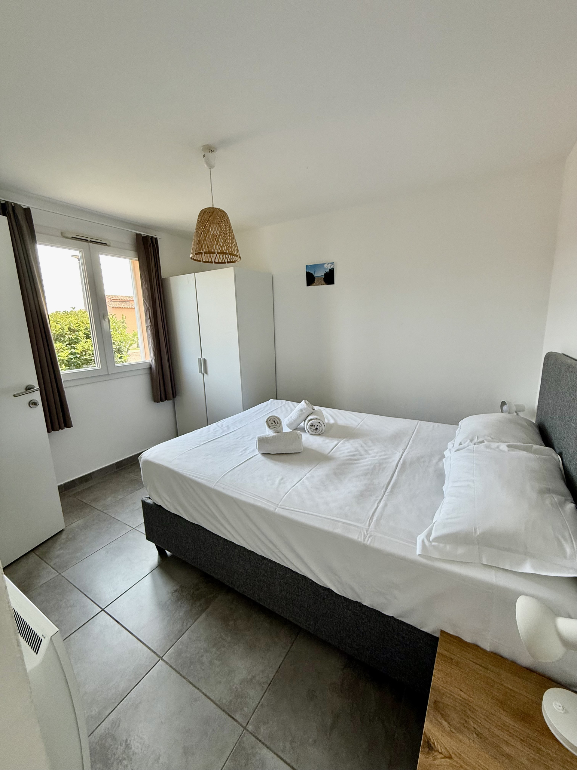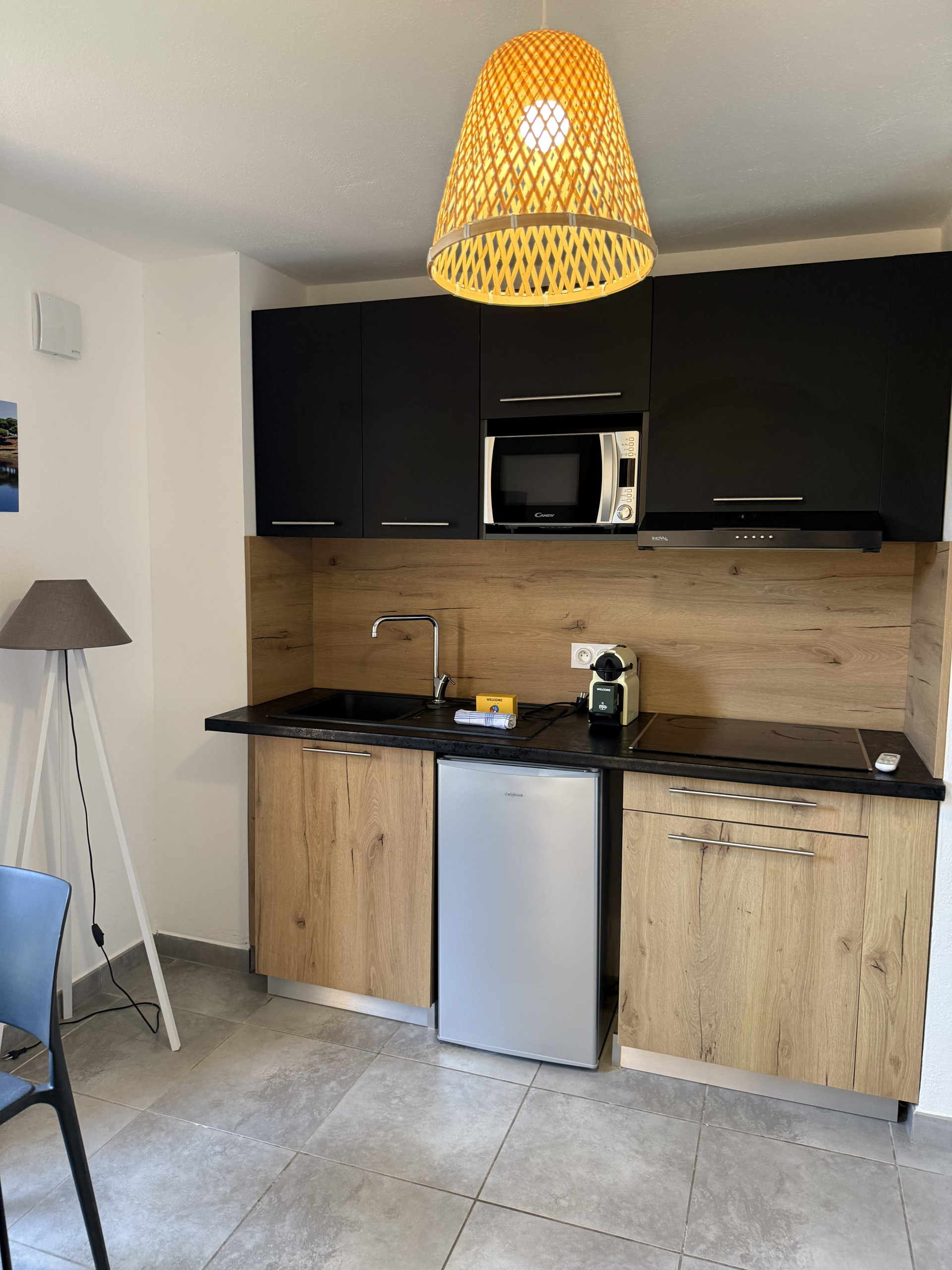 Parfait pour une famille de 4 personnes, ce logement climatisé de 25m2 au 2ème étage, comprend une chambre, une salle d'eau toilette, une cuisine américaine tout équipée, vitrocéramique, réfrigérateur, micro ondes, machine à café Nespresso, grille-pain, bouilloire et tous les ustensiles nécessaires, chauffage électrique.