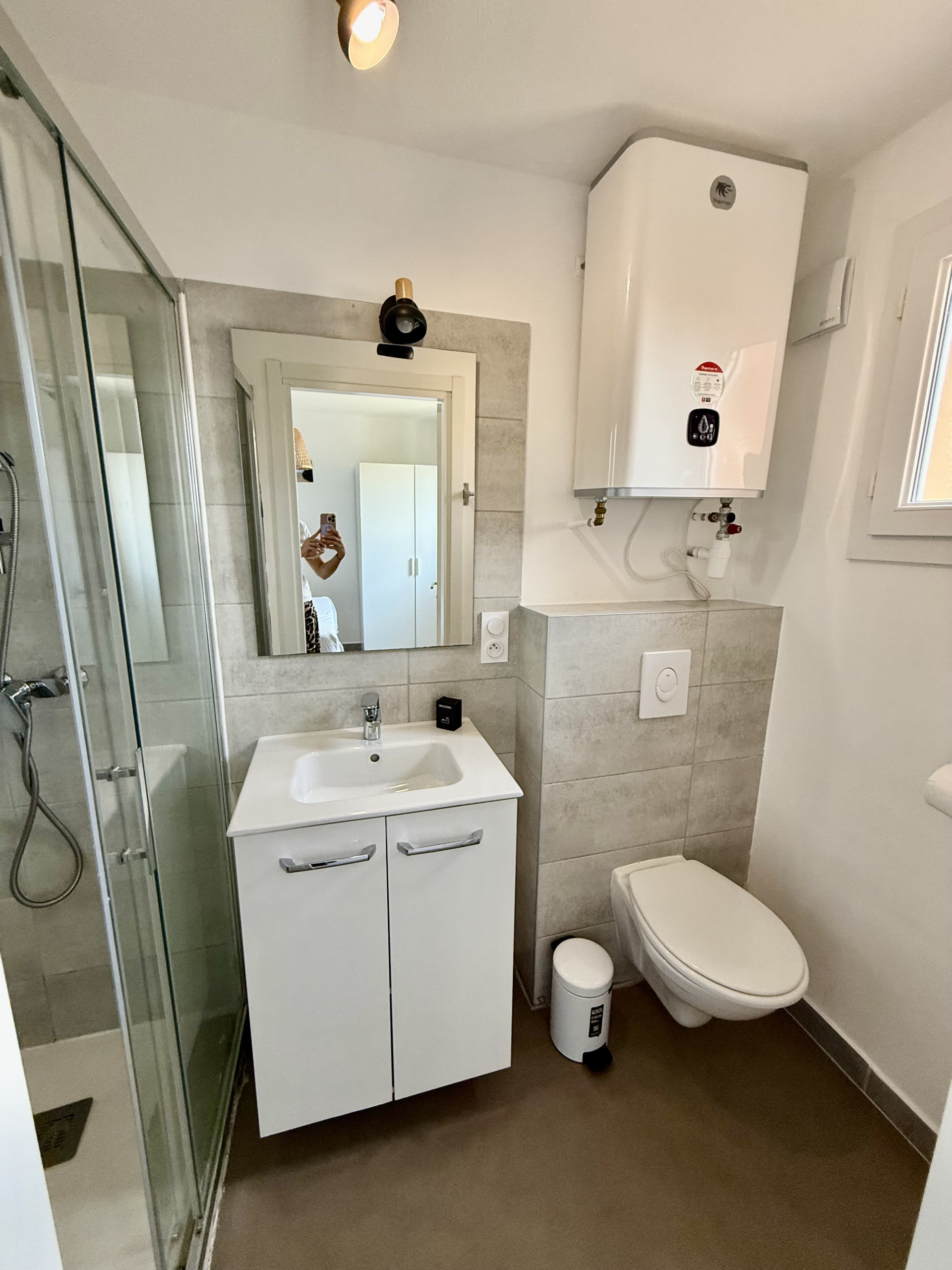 Parfait pour une famille de 4 personnes, ce logement climatisé de 25m2 au 1 er étage, comprend une chambre, une salle d'eau toilette, une cuisine américaine tout équipée, vitrocéramique, réfrigérateur, micro ondes, machine à café Nespresso, grille-pain, bouilloire et tous les ustensiles nécessaires, chauffage électrique.
