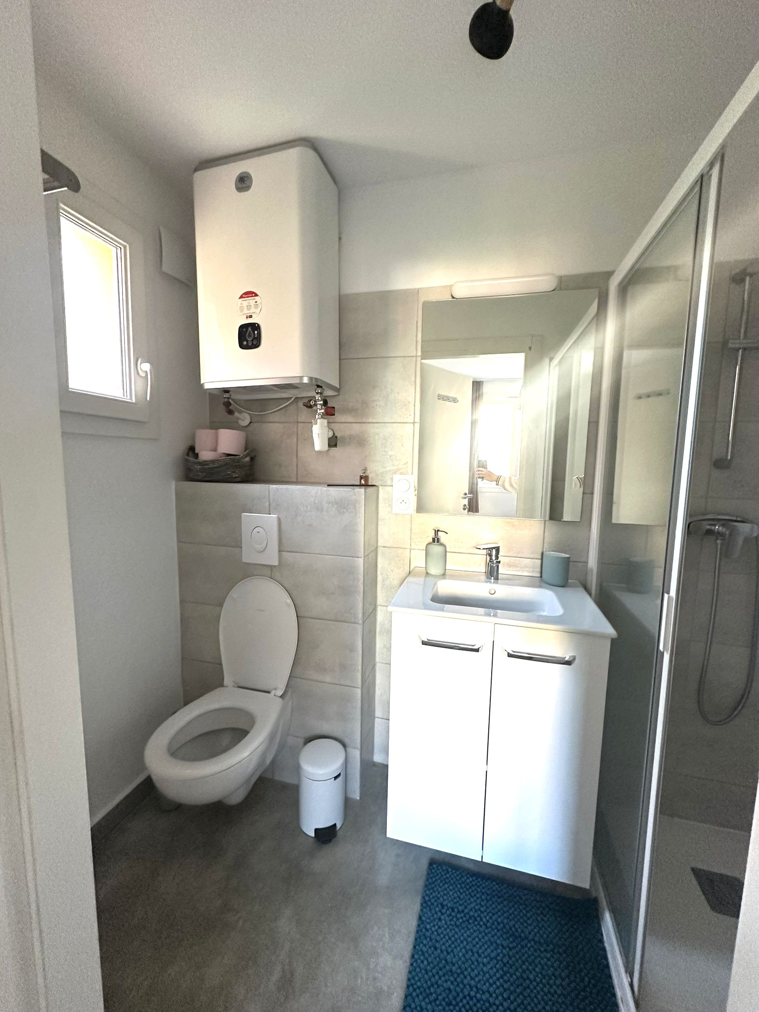 Parfait pour une famille de 4 personnes, ce logement climatisé de 25m2 au 1 er étage, comprend une chambre, une salle d'eau toilette, une cuisine américaine tout équipée, vitrocéramique, réfrigérateur, micro ondes, machine à café Nespresso, grille-pain, bouilloire et tous les ustensiles nécessaires, chauffage électrique.