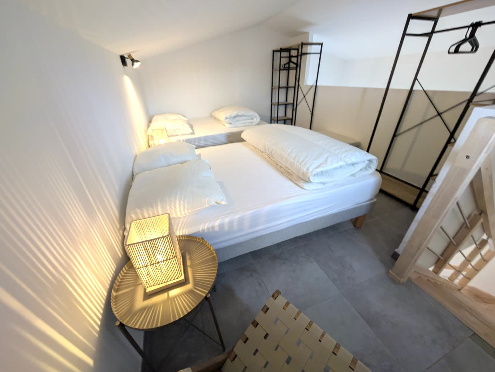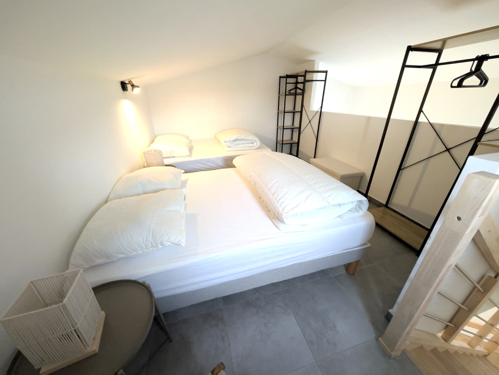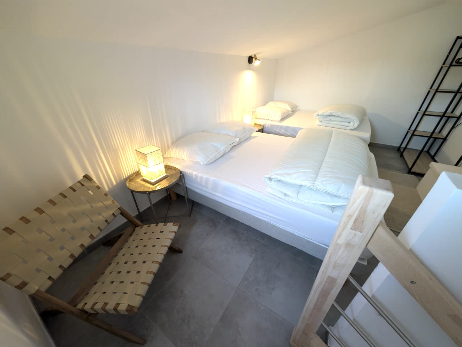 L'intérieur dispose de deux chambres confortables : l'une équipée d'un lit king size et l'autre d'un canapé-lit double, garantissant un repos optimal pour tous les occupants. La cuisine américaine entièrement équipée vous permettra de préparer de délicieux repas avec ses nombreux équipements : réfrigérateur, congélateur, four, micro-ondes, machine à café, et bien plus encore.